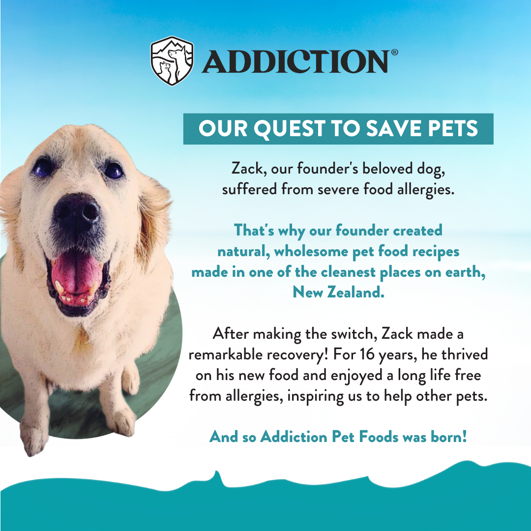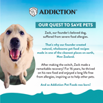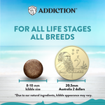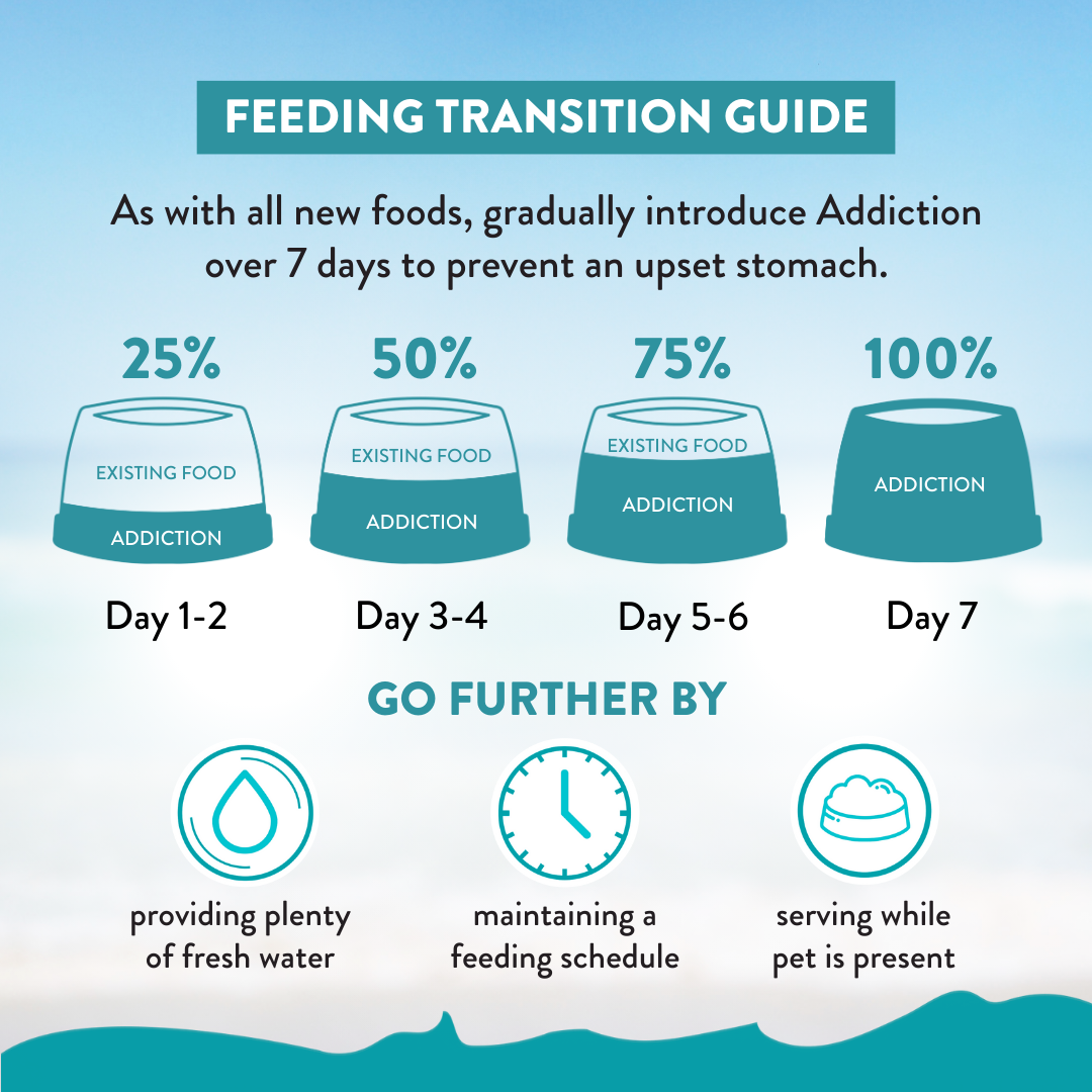 As with all new foods, gradually introduce Addiction over 7 days to prevent stomach upsets. Feed 25% Addiction and 75% of the old food for first 2 days and gradually increase proportion of Addiction over the next 5 days. By the 7th day, you can be confident feeding Addiction for your pet's full meal. It is critical that Addiction is slowly introduced to your pet over the 7-day period. Not following these guidelines may result in your pet experiencing gastrointestinal discomfort or related symptoms.