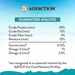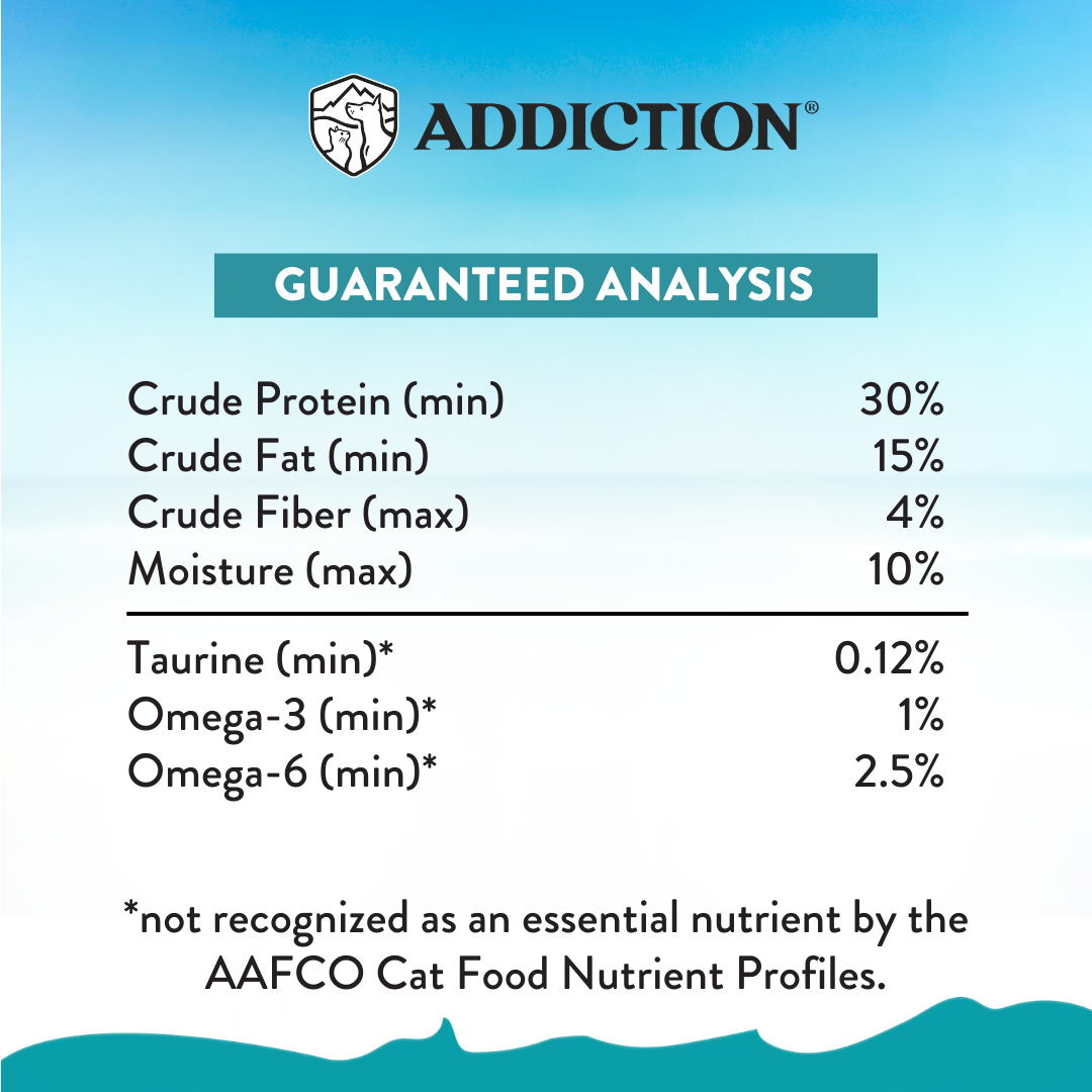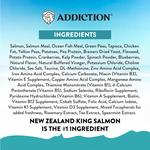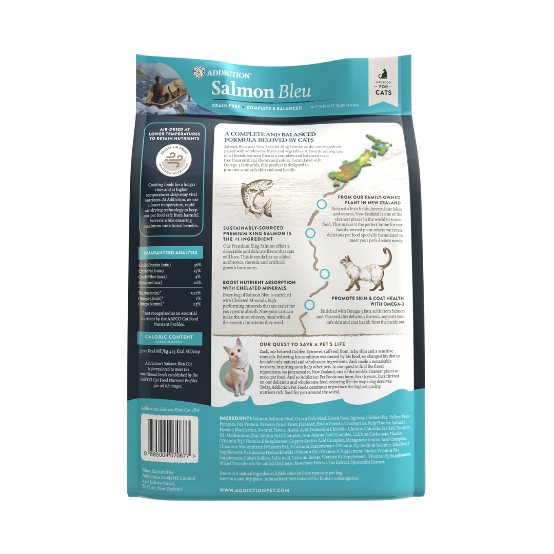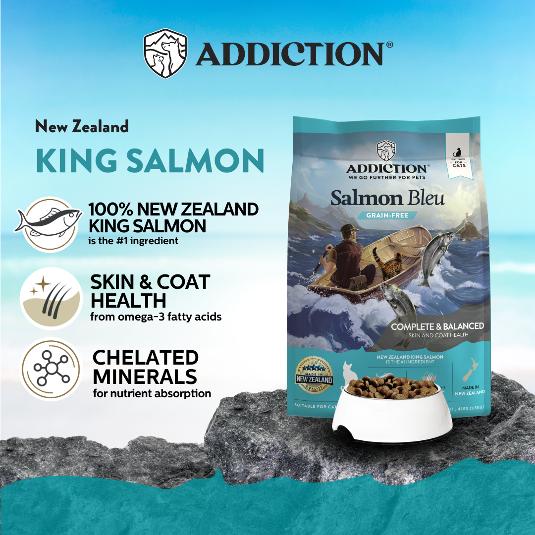 Addiction Salmon Bleu is a premium dry cat food featuring New Zealand King Salmon, known for its Omega-3 fatty acids. It's a nutritionally balanced meal that enhances skin and coat health, vitality, and overall well-being.