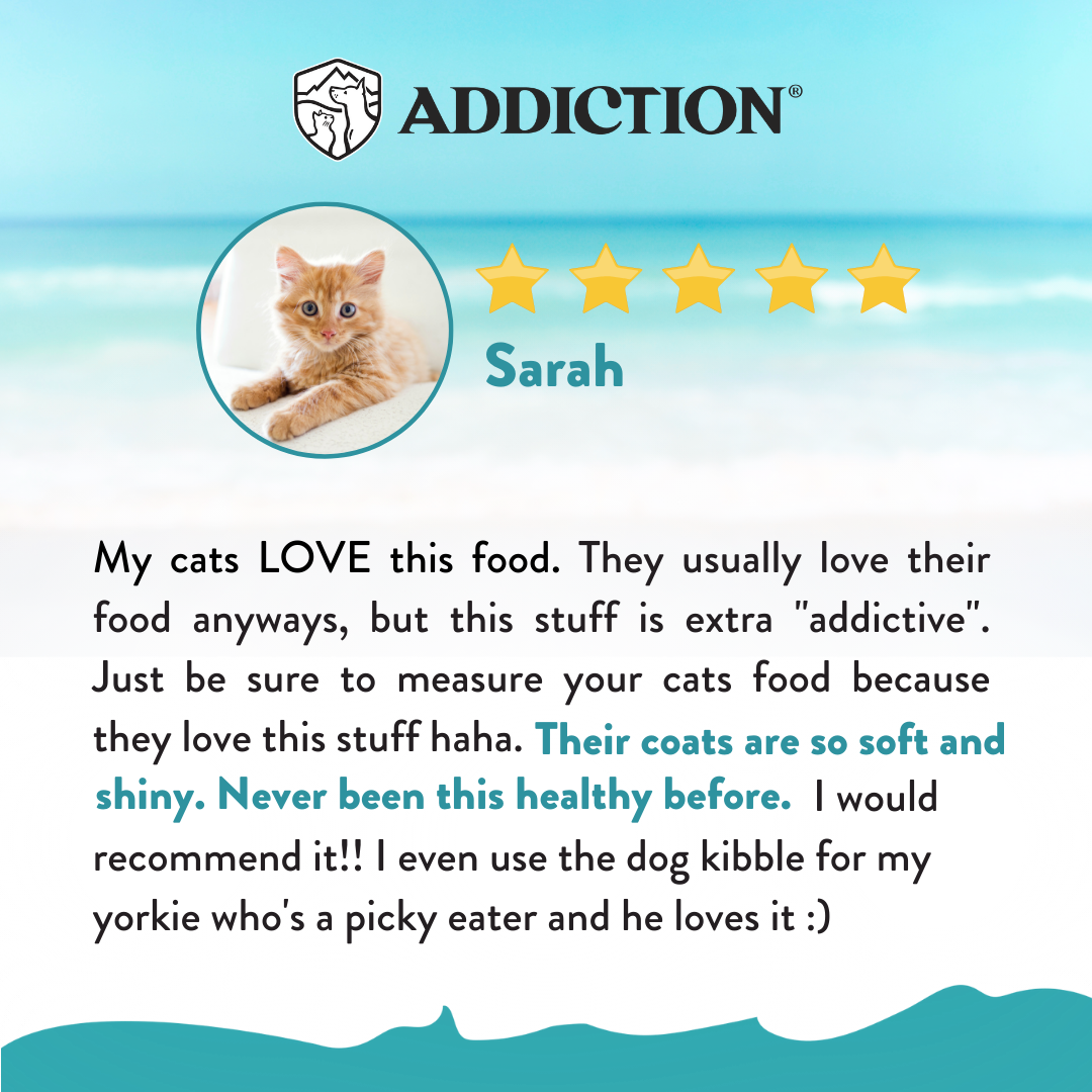 I live with 5 felines and they just can't get enough of Addiction - Salmon! I don't feed it to them everyday being the cost is up there, but they know where it is and they ask for it every opportunity they get! I am very pleased that this is a quality food that we can depend on. Just wish it was sold in larger quantities and a little more resonable price.