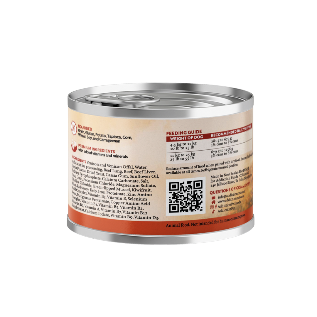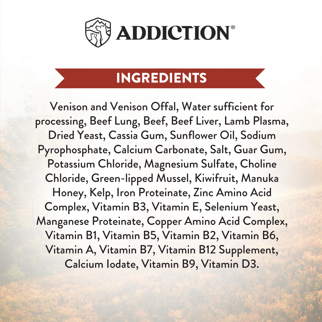 Venison and venison offal, water sufficient for processing, beef lung, beef, beef liver, lamb plasma, dried yeast, cassia gum, sunflower oil, sodium pyrophosphate, calcium carbonate, salt, guar gum, potassium chloride, magnesium sulfate, choline chloride, green-lipped mussel, kiwifruit, Manuka honey, kelp, iron proteinate, zinc amino acid complex, vitamin B3, vitamin E, selenium yeast, manganese proteinate, copper amino acid complex, vitamin B1, vitamin B5, vitamin B2, vitamin B6, vitamin A, vitamin B7, vitamin B12 supplement, calcium iodate, vitamin B9, vitamin D3.